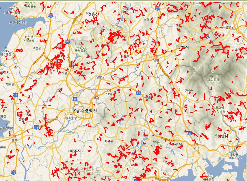 축령산, 회문산, 금성산, 조계산쪽과 장수쪽에 임도가 많은 것을 알 수 있다.