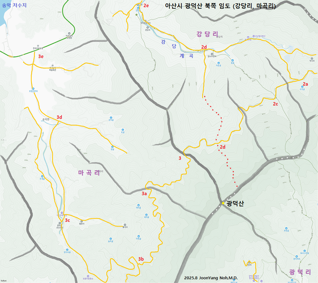 - 2a(갈림길/to강당계곡) - 2c(광덕산 등산로 안내판) - 2d(광덕산 등산로) - 2d - 2e(강당골 주차장)