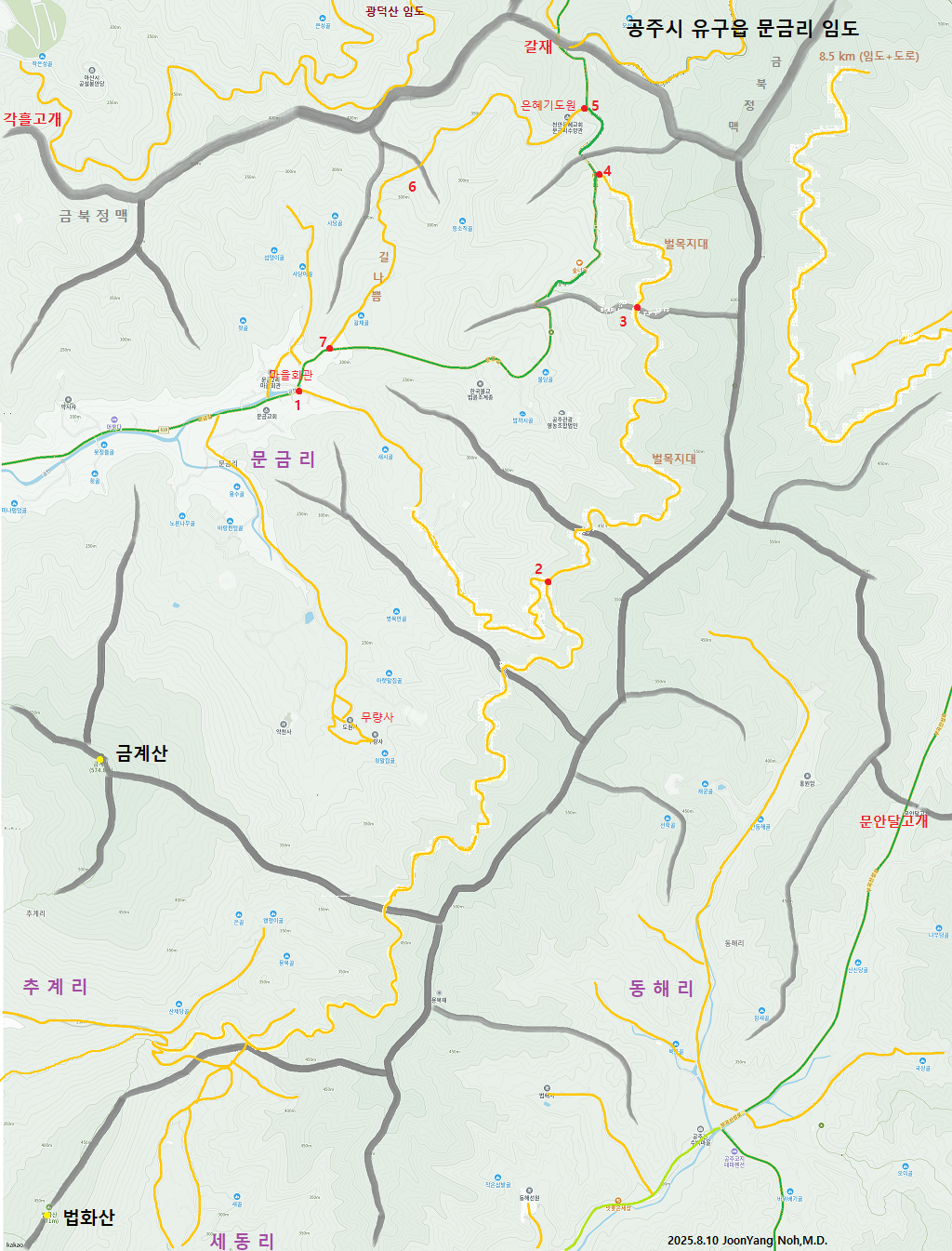산행(걷기): 1(문금2리 마을회관) - 2(임도 갈림길) - 3 - 4(도로 접점) - 5(은혜교회 수양관) - 6 - 7(도로 접점)