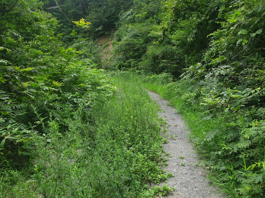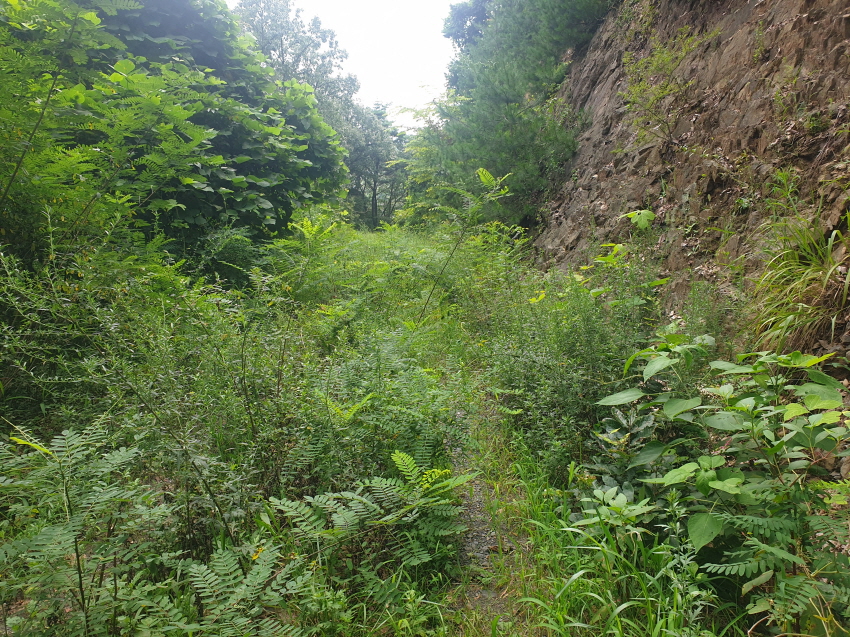 관리되지 않은 임도. 임도 중간에 풀과 나무(아카시아)가 높게 자라 있다