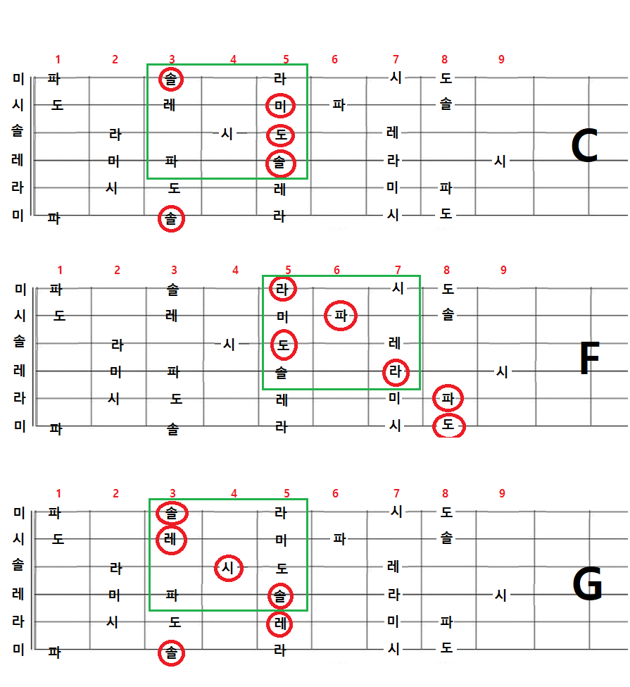 - 3번선 5프렛이 도가 되는 경우 C키를 중심으로 스케일 연습이 필요하고, 3화음 코드의 모양이 어떻게 변하는지 모양으로 기억해 두면 이동도법에 의해서 많은 장조 노래를 연주/반주할 수 있다.