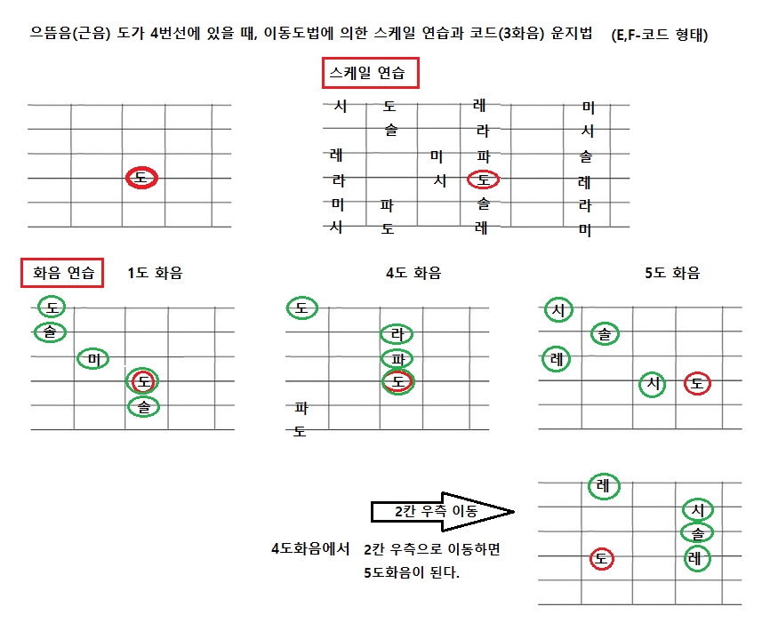 - 근음(Do)이 1, 4번선에 있을 때, 근음 기준으로 "E-코드" 모양의 계명이 "솔도미"가 된다. 이를 기억하면 스케일 연습에 도움이 된다. 이는 개방현에서 E-코드 모양이 1도 화음의 형태가 된다.