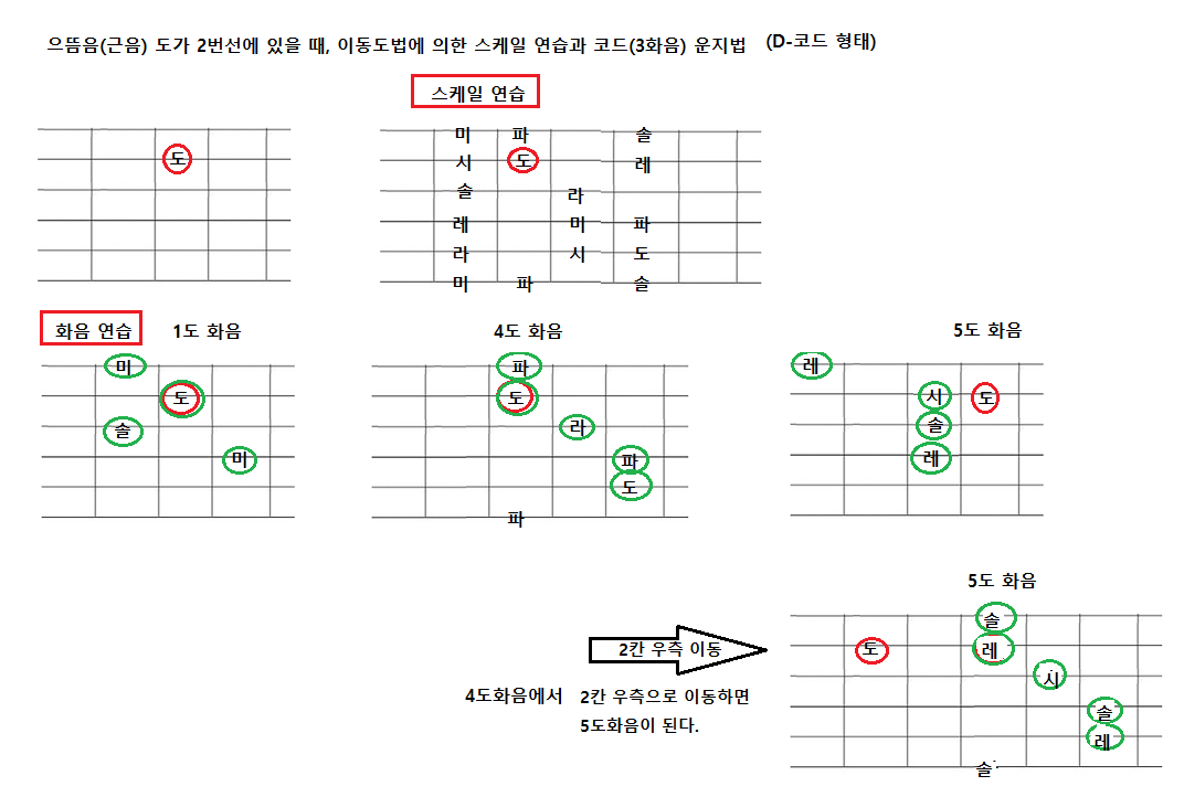 - 근음(Do)이 2번선에 있을 때, 근음 기준으로 계명이 삼각형(D-코드 모양)이 "솔도미"가 된다. 이를 기억하면 스케일 연습에 도움이 된다. 이는 개방현에서 D-코드 모양이 1도 화음의 형태가 된다.