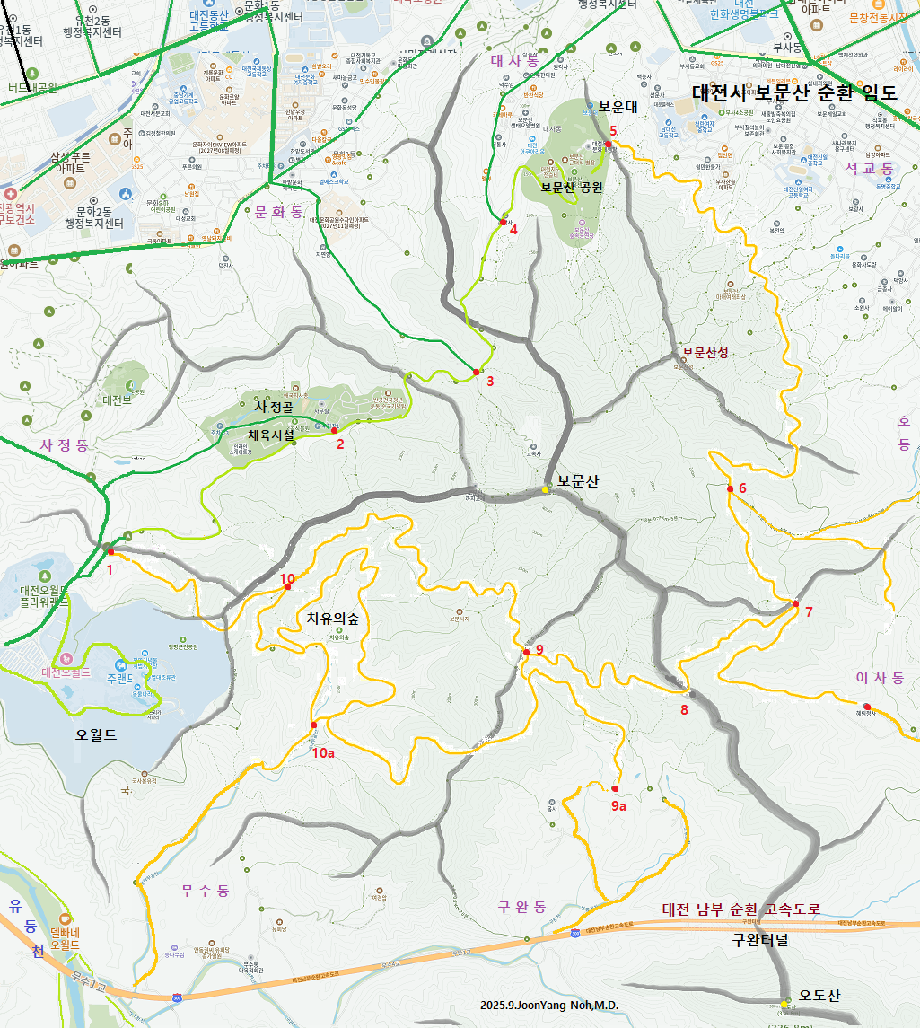 산행(걷기): 1(오월드/사정동) - 10(갈림길/무수동) - 9(감림길/구완동) - 8(대전시 둘레길/보만식계) - 7(갈림길/이사동) - 6(갈림길/호동) - (석교동 임도) - 5(보운대)