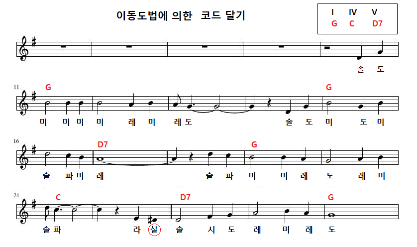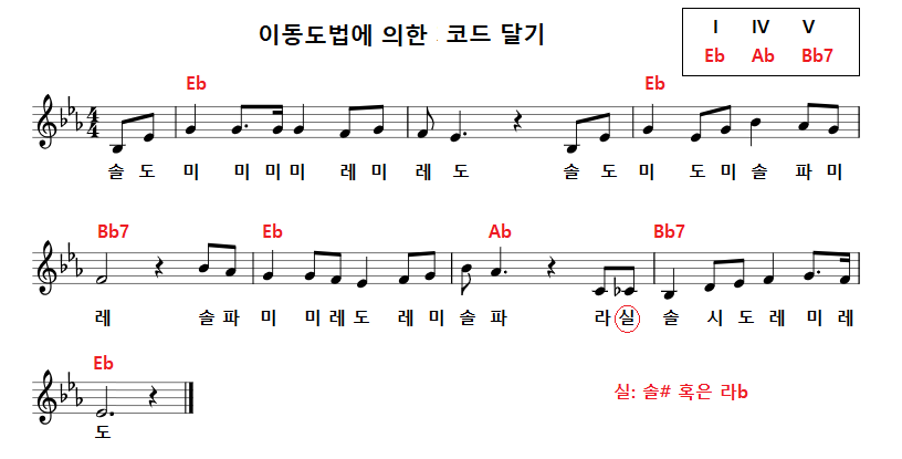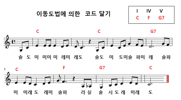 다시 요약하면 위의 악보(G, Eb, F, C-장조)에서 이동도법에 의한 계명은 동일하기 때문에 "도미솔" 멜로디는 1도화음, "파라도"멜로디는 4도화음, "솔시레"멜로디는 5도화음, "솔시레파"멜로디는 5도(V7화음)으로 반주를 넣어줄 수 있다.모두 그런 것은 아니지만 일반적으로 위의 규칙에 의해서 코드를 넣으면 되고, 노래의 느낌에 따라서 변형 코드(2도-Dm, 6도-Am, Dim, Aug, Sus 등)를 적용할 수도 있다.