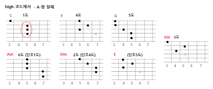 위의 그림을 보면 high코드에서 코드의 모양 3가지(A형, D형, E형) 형태중 A형이 으뜸화음(1도)이다.