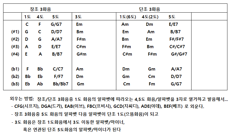 장/단조를 구분한 후, 개방현 음계에서 으뜸화음을 찾았다면 아래의 "각 key별 3화음"을 떠올리면서 1,4,5도를 구분해서 반주를 넣어 주면 된다. 더 익숙해지면 3가지 코드보다는 3가지 모양으로 기억하면 실전에서 더 빨리 적용할 수 있다.