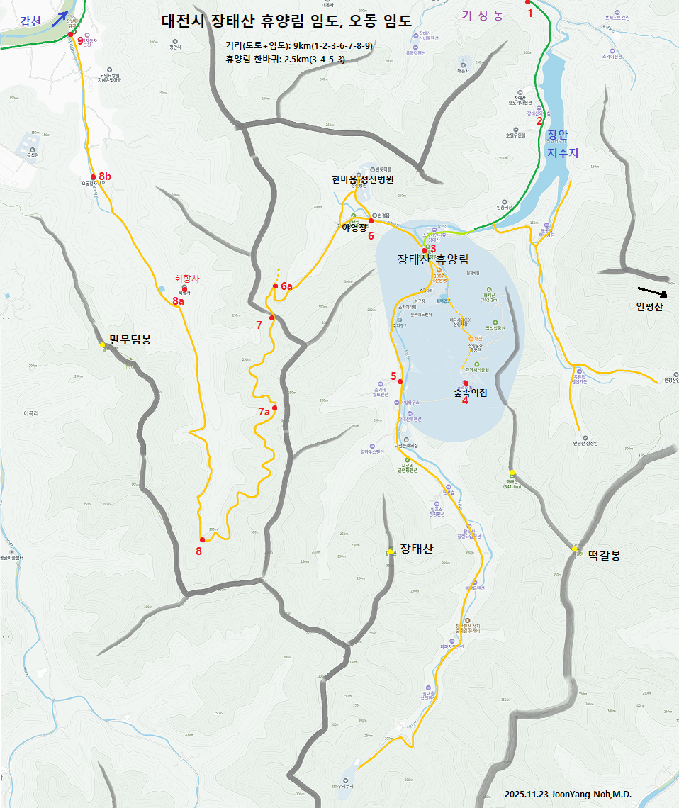 산행(걷기): 1(장안리) - 2(장안 저수지) - 3(휴양림 입구) - 4(숲속의집) - 산길(길없음) - 5(마을회관) - 출렁다리 - 3 - 6(야영장/정신병원) - 6a(갈림길) - 7(고개) - 7a(등산로 안내판) - 8 - 8a(회항사) - 8b(오동나무) - 9(도로/버스정류소)