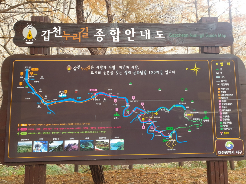 갑천 누리길 안내판. 윗 지도에서 6-7-8-9 임도가 갑천 누리길이다.