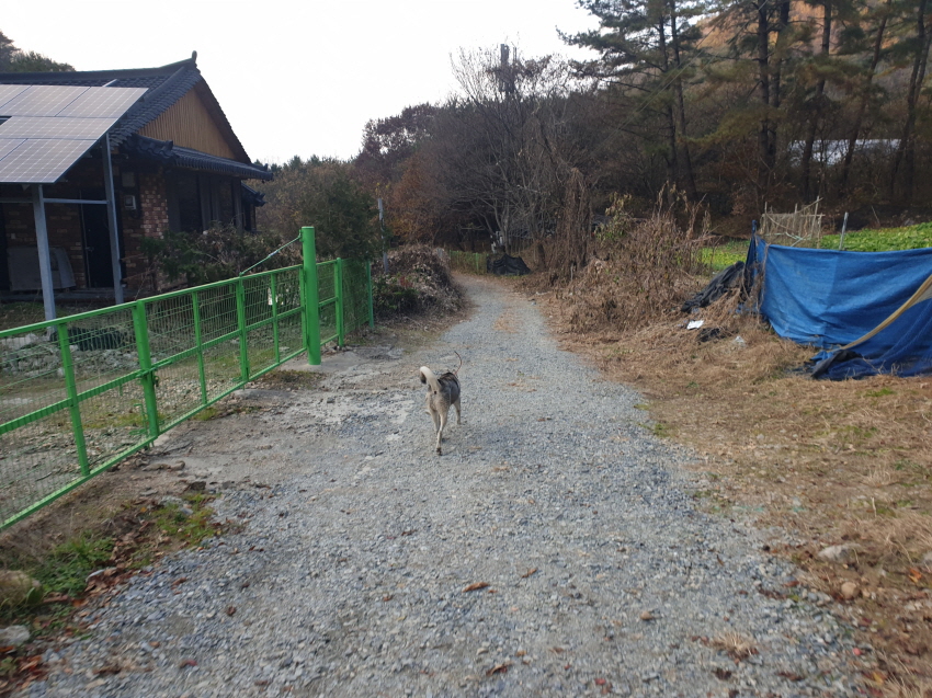 개 한마리 따라옴. 맷돼지 몰이 사냥으로 훈련된 개 인듯. 짖거나 물지는 않는다