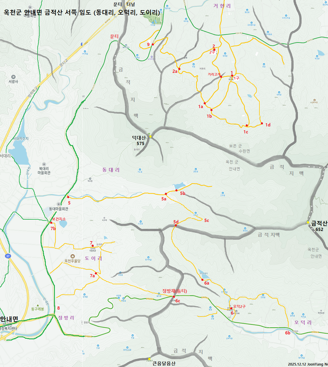 산행(걷기): 5(동대리 마을회관) - 5a - 5b - 5a - 5c - 5d(고개) - 6a - 6(오덕2구 마을회관) - 6c(정방재/등티) - 7a - 7(도이리 마을회관) - 7b(보건지소) - 5(원점회귀)
