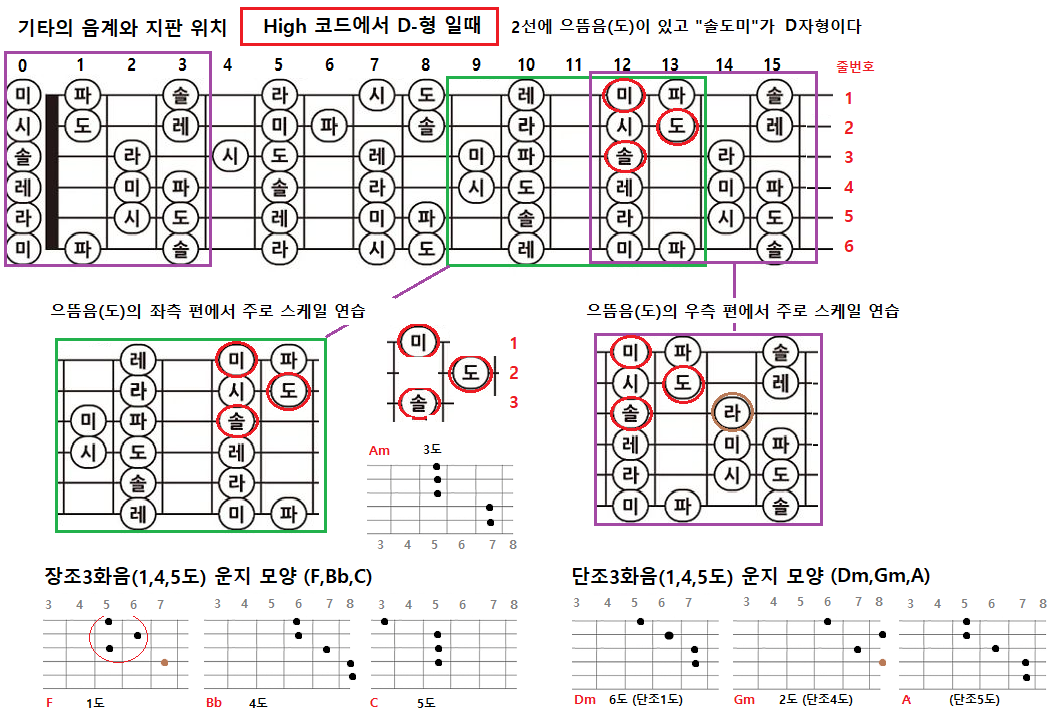 High 코드에서 기타줄 2선에 으뜸음(도)이 있을 경우 "도"를 기준으로 아래/위로 "솔도미"가 D자형으로 위치해 있다. "솔도미"의 D자형 모양을 "솔도미"삼각형으로 부르기로 할때, "솔도미"삼각형의 좌측과 우측에서 각각 스케일 연습이 필요하다. 멜로디와 반주를 동시에 연주할 때 스케일과 화음의 모양을 잘 생각한다면 보다 연주를 쉽게 할 수 있다.