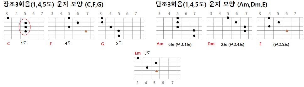위의 1도화음(F-코드)는 D-형이고, 위의 4도화음(Bb-코드)는 E-형이고 위의 5도화음(C-코드)는 A-형이다. 단조 3화음에서는 위의 1도화음(Dm)는Am-형이고, 4도화음(Gm)은 Dm-형이고, 5도화음(A-코드)은 E-형이다. 멜로디와 반주를 동시에 연주할 때 스케일과 화음의 모양(장조: D, E, A형, 단조: Am, Dm, E형)을 잘 생각한다면 보다 연주를 쉽게 할 수 있다.