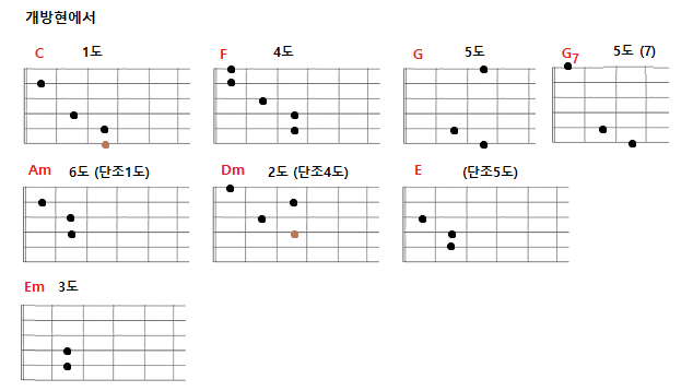 장조의 3화음(I, IV, V)은 C, F, G(G7)과 단조의 3화음(I, IV, V)은 Am, Dm, E(E7) 관련 코드로 기억해 둔다면, 많은 C-장조(C), A-단조(Am) 노래를 반주할 수 있다.