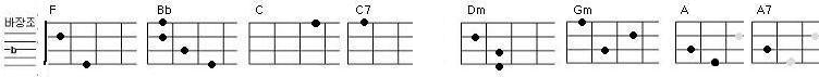 위의 C-key와 관련된 코드들의 모양은 우쿨렐레에서 F-key 관련 코드들 모양과 동일/유사하다.