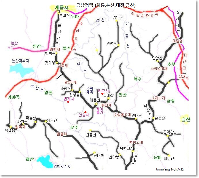 (참고) 금남정맥 개요도(덕목재-물한이재) (계룡, 논산, 금산 구간)